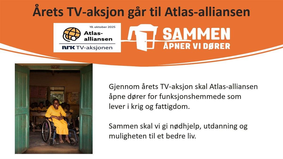 Årets TV-aksjon går til Atlas-alliansen og skal åpne dører for funksjonshemmede som lever i krig og fattigdom. Sammen skal vi gi nødhjelp, utdanning og muligheten til et bedre liv.